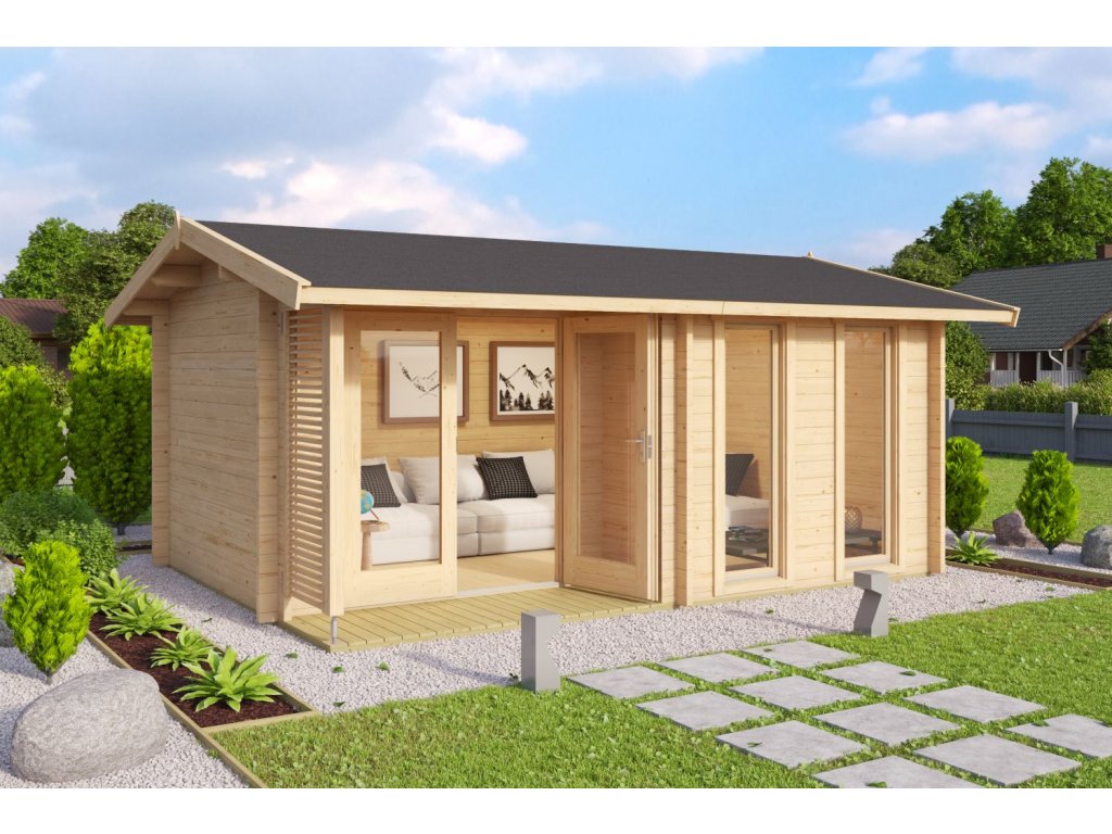 Detaily: Domek je vyroben ze severského dřeva o tloušťce 44 mm. Domek je vyroben a dodán jako stavebnice. Součástí dodávky je kompletní kování, podlaha a dřevěný rošt. Podlaha a střešní prkna jsou řešeny pero-drážkovým systémem. Okna i dveře jsou vyplněny dvojsklem. Součástí dodávky nejsou střešní krytiny, barvy a laky. Ceny zahradních domků jsou uvedeny bez montáže a dopravy.