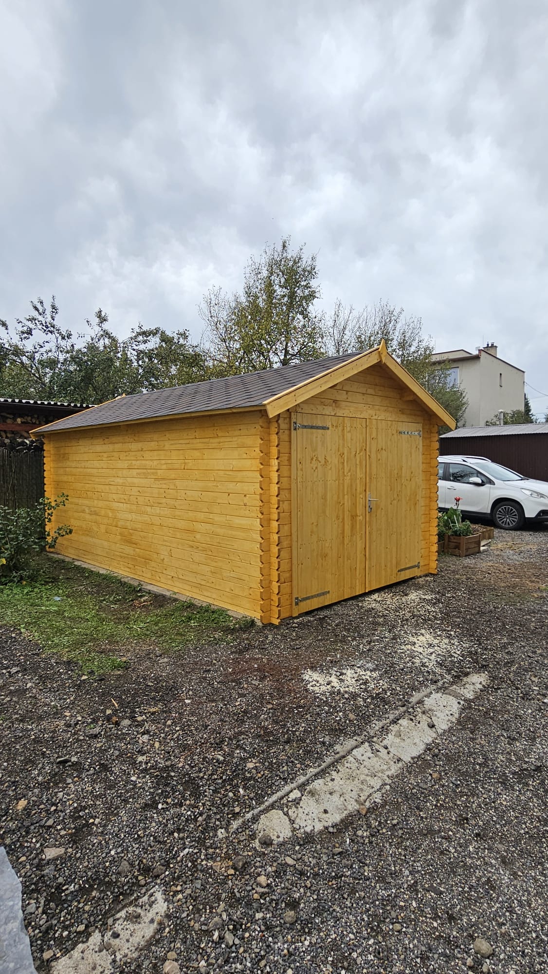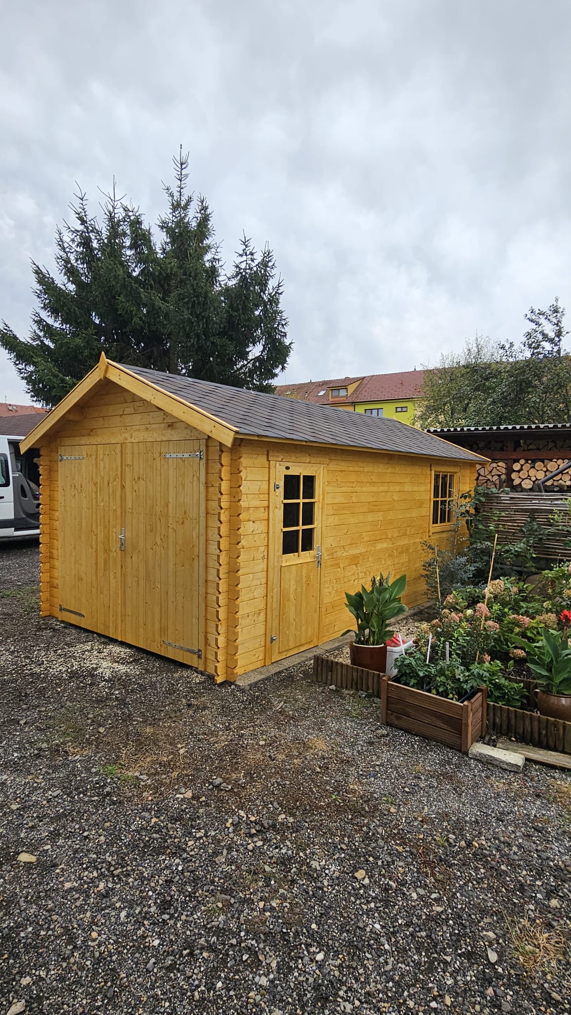 Zahradní dřevěná garáž je vyrobena ze dřeva severského smrku o tloušťce 34 mm.