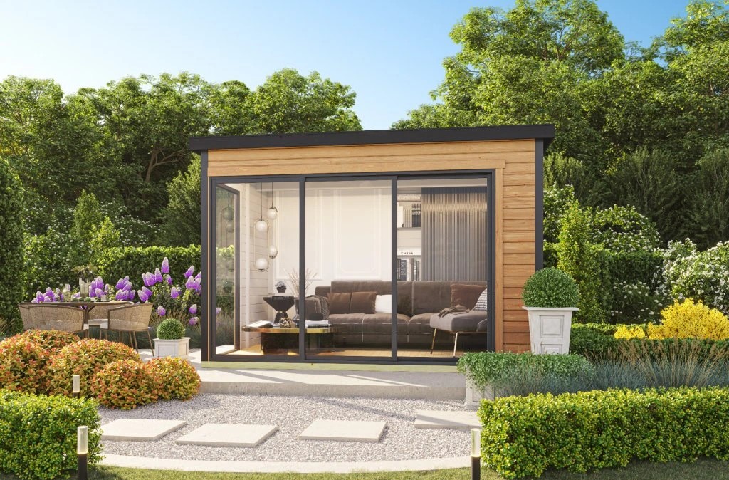 Moderní zahradní domek s velmi pěkným designem za solidní cenu. Díky pultové střeše a panoramatickému oknu bude ozdobou každé, i menší zahrady.