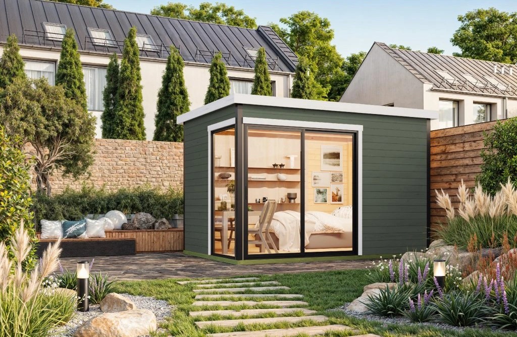 Moderní zahradní domek s velmi pěkným designem za solidní cenu. Díky pultové střeše a panoramatickému oknu bude ozdobou každé, i menší zahrady.