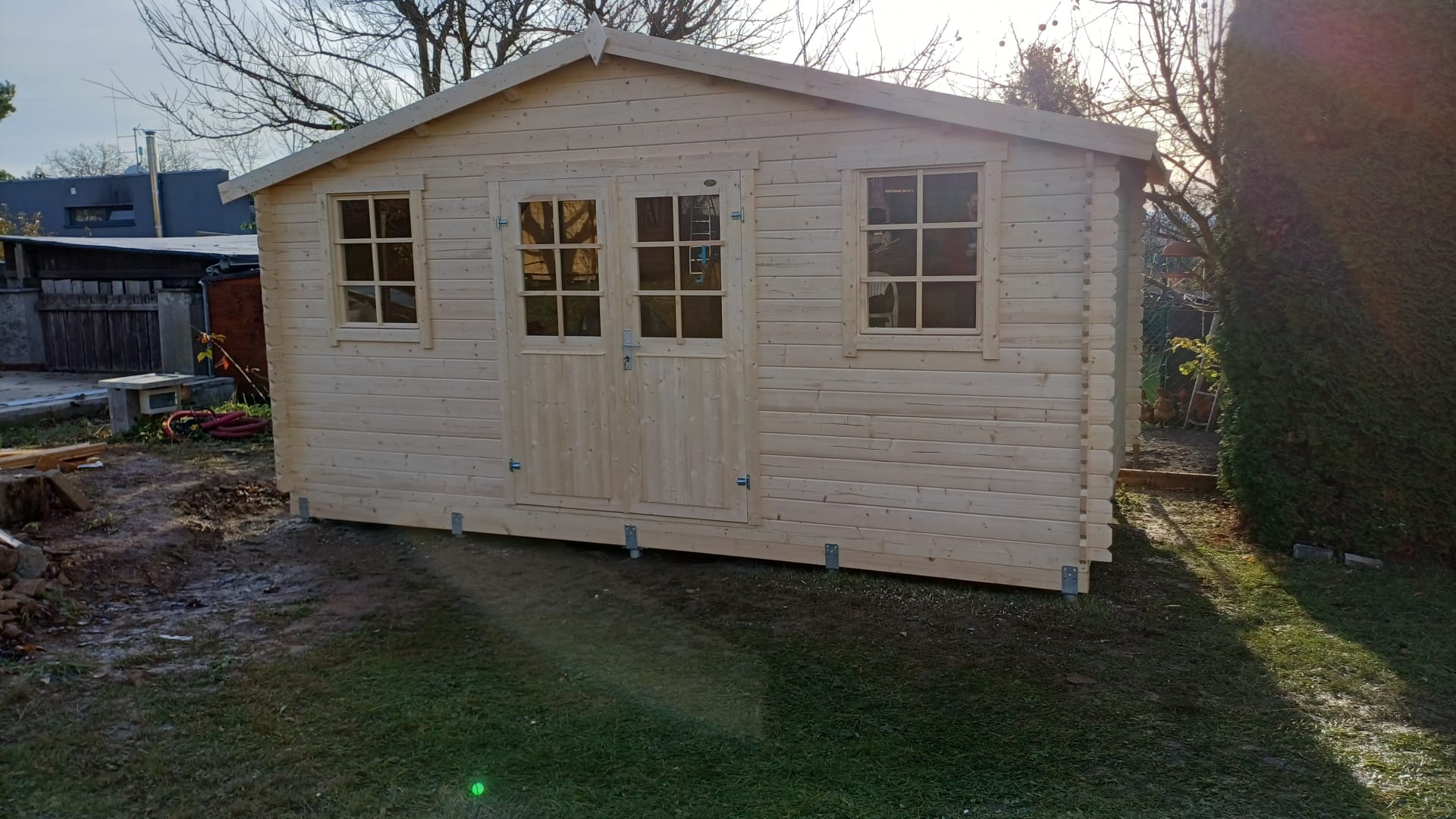 Udo je kvalitní roubený zahradní domek se sedlovou střechou vhodný na každou zahradu se širokými poloprosklenými dveřmi a dvěma okny v přední části - je tedy pěknou dekorací zahrady. Díky oknům v něm navíc bude dostatečné světlo. Výška hřebenu činí 256,5 cm, výška stěn 193,8 cm.